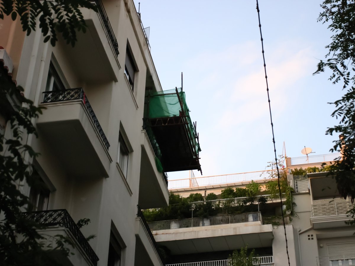Ειδική κατασκευή μεταλλικών σκαλωσιών στην περιοχή του Κολωνακίου. Η κατασκευή των ικριωμάτων αιωρείται στην εξωτερική πλευρά μπαλκονίου στον 4ο όροφο πολυκατοικίας προκειμένου να εκτελεστούν οι απαραίτητες εργασίες ανακαίνησης.