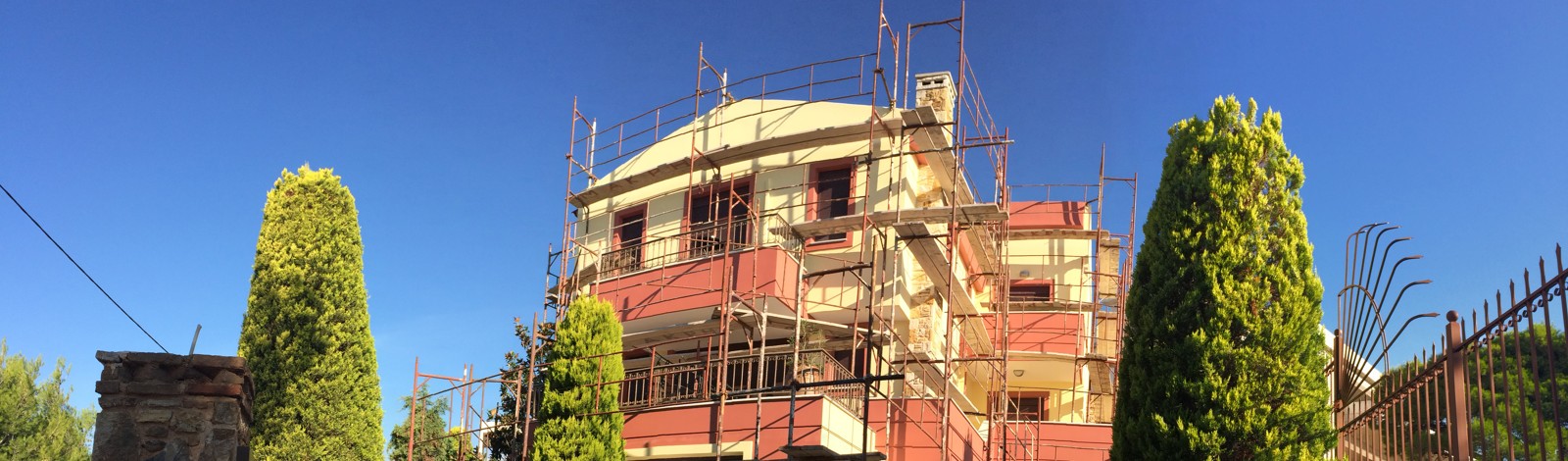 Ενοικίαση και τοποθέτηση μεταλλικών σκαλωσιών με ξύλινα δάπεδα σε μονοκατοικία στο Πικέρμι, περιοχή Διώνη.